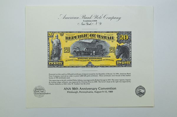 Republic of Hawaii. Souvenir card from ABNC for the ANA Convention, 1989, featuring a two-color specimen of the 1896 $20. note.