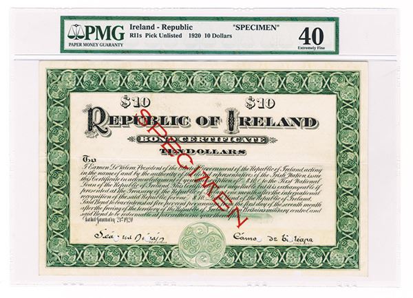 Ireland, January 21st, 1920, Specimen $10, 5% Gold Bond, RI 1s, P-Unlisted, Black text on green border and underprint, "ƒ.Exchangeable if presented at the Treasury of the Republic of Ireland one..... freeing of the territory of the Republic of Ireland from Britain's military control and said bond....". Specimen overprint, POC's, back blank, PMG graded Extremely Fine 40. Rare Irish specimen bond.