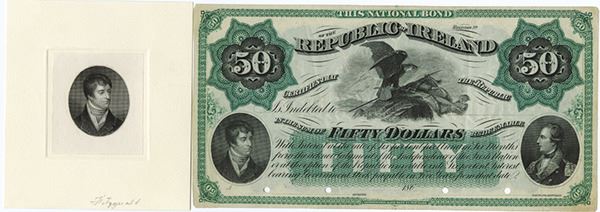Ireland, $50, Specimen Bond/Banknote, 6% bond, Black on green border and under print, Eagle on Irish Independence flag, large outlined FIFTY in middle and portraits of Fitzgerald at left and Irish notable at right with Fitzgerald portrait with matching Large Die Proof vignette, back green. AU to Uncirculated. Continental BNC. First time we have offered this variety. (From the collection of John E. Herzog).