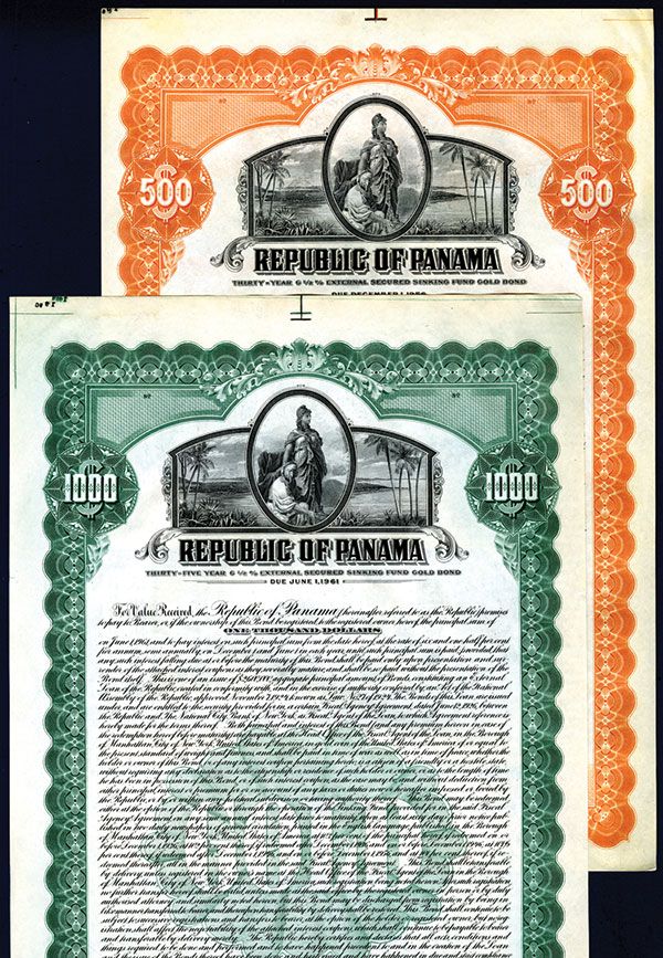 Lot of 2 Panama Bonds; 1)1926, $500 30 Year 6 1/2% Specimen Bond, Black print on orange border and underprint, Vignette of view of tropical shores top center with Minerva with Native American in front, VF condition, HBNC. 2)1926, $1000 30 Year 6 1/2% Specimen Bond, Black print on green border and underprint, Vignette of view of tropical shores top center with Minerva with Native American in front, VF condition, HBNC.