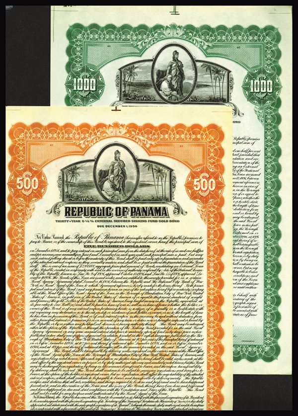 Panama, Lot of 2 bonds, includes 1926, $500, black on orange border and underprint and $1000 Black on green border and undertint, both uncancelled Archival Specimen bonds, No Specimen overprints or POC's, XF to uncirculated condition, Standing allegorical Liberty with Native Panamanian in middle flanked by tropical palm tree scene, Hamilton BNC. Rare early Panama fiscal documents.