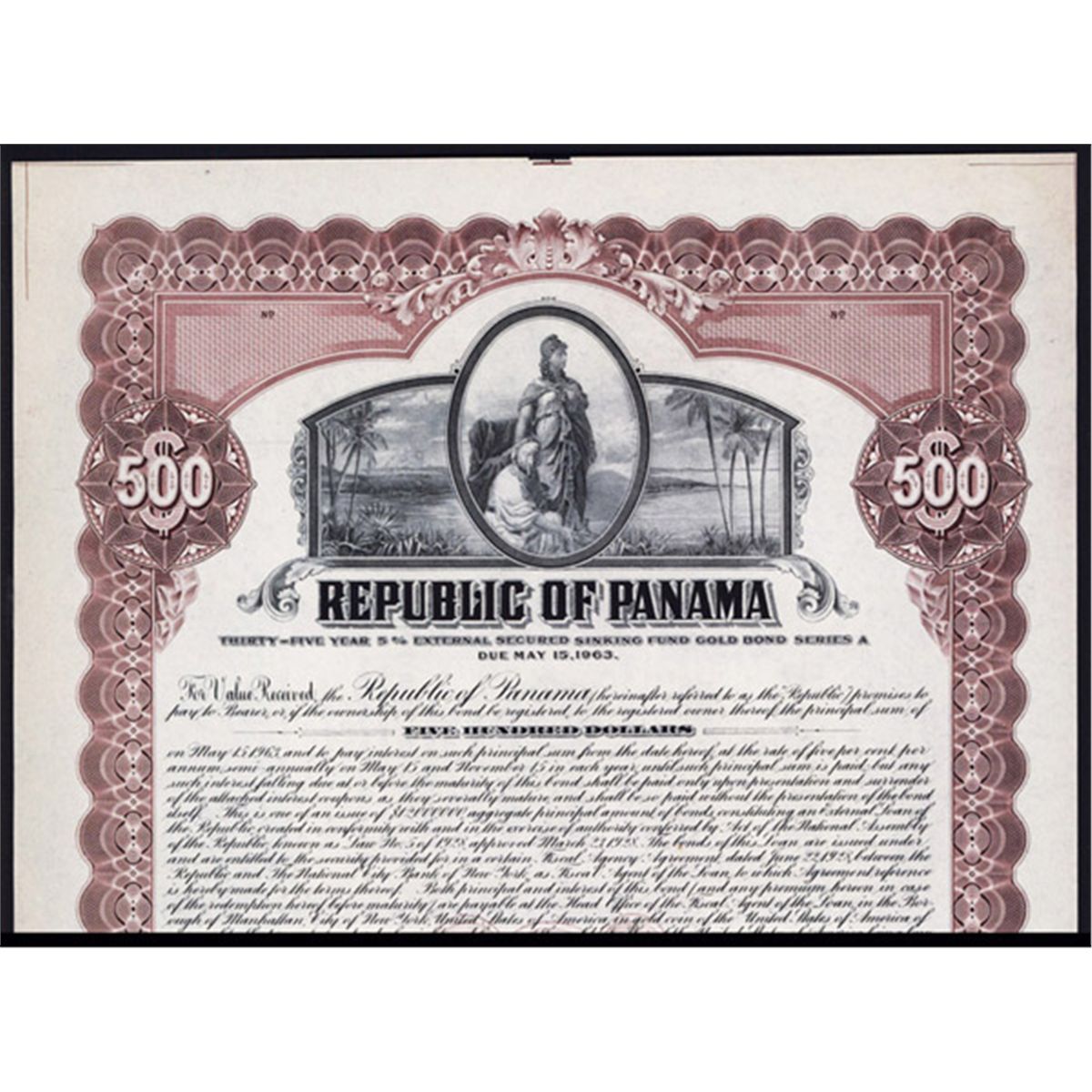 Panama, 1926, $500, Uncancelled Archival Specimen bond, black on brownish purple border and underprint, No Specimen overprints, XF condition, Standing allegorical Liberty with Native Panamanian in middle flanked by tropical palm tree scene, Hamilton BNC.