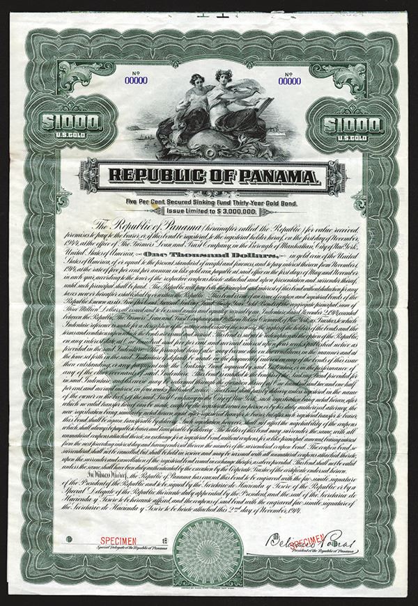 Panama, $1000, 5% Secured Sinking Fund 30 Year Gold Specimen Bond, Vertical format, Two allegorical women sitting on globe top center, POC's, VF condition, ABNC.