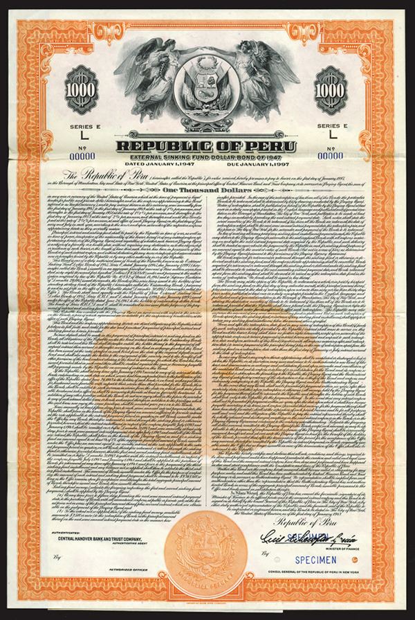 Peru. $1000 Specimen 2 1/2% Series E L External Sinking Fund Coupon Bond, Black print on orange border and under tint, Seal of Peru at top with winged allegorical women, Specimen overprints and POC's, VF-XF condition, ABNC.