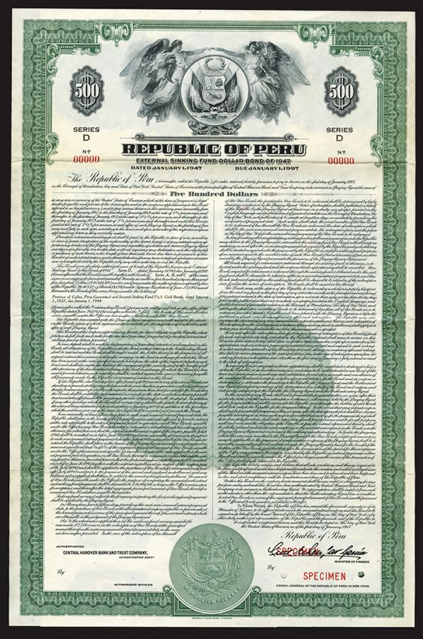 Peru. $500 Specimen 2 1/2% Series D External Sinking Fund Dollar Coupon Bond, Black print on green border and under tint, Seal of Peru at top with winged allegorical women, Specimen overprints and POC's, VF-XF condition, ABNC.
