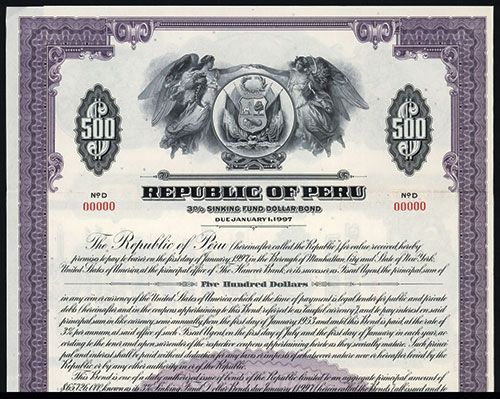 Peru, 1952, $500, 3% Sinking Fund Dollar Bond, Black on purple border and underprint, Country seal top center flanked by two winged allegorical women, VF-XF condition, ABNC.