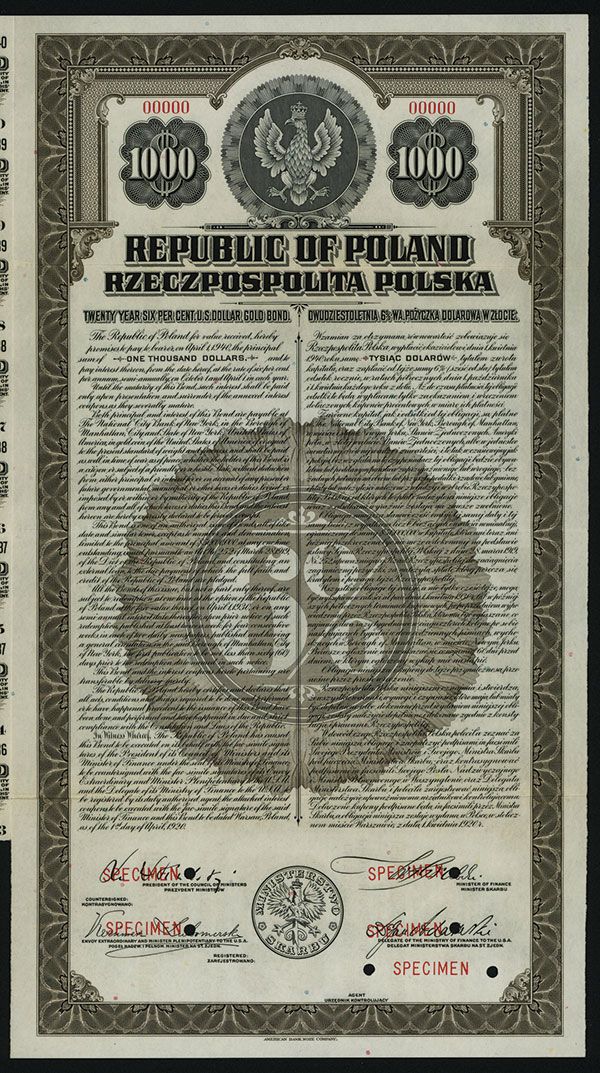 Poland, 1920, $1000 20 Year 6% US Dollar Specimen Gold Bond, Black printing with brown border and underprint, Country seal top center, Change of bond terms stamped center in blue, POC's and red SPECIMEN overprints, VF condition, ABNC.