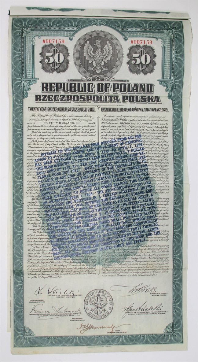 Poland, 1920. $50 I/U 6% Twenty Year Gold Coupon Bond, Black on green border and underprint with Polish seal at top, Stamp over face stating interest rates were lowered to 4 1/2%, Fine-VF condition with damage to margins, ABNC.