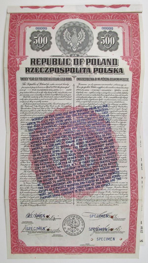 Warsaw, Poland, 1920. $500 Specimen 6% U.S. Dollar Gold Coupon Bond in Polish and English, Black text with red border and undertint, Polish coat of arms depicted at top center. Overprinted in blue the change of % and terms and the change from being a Gold Bond to coming off the Gold Standard and payable "in any Coin or Currency of the U.S. of America which at the time of payment is Legal Tender", Blue specimen overprints, 00000 serial numbers, and POCs. VF condition, ABNC. Rare