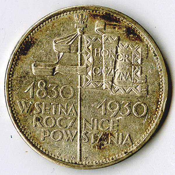 PolandÉ. 1930, 5 Zlotych, Y#19.1, 0.750 Silver, 0.4312 oz, 33 mm, Centennial of 1830, VF to Choice VF with spots.
