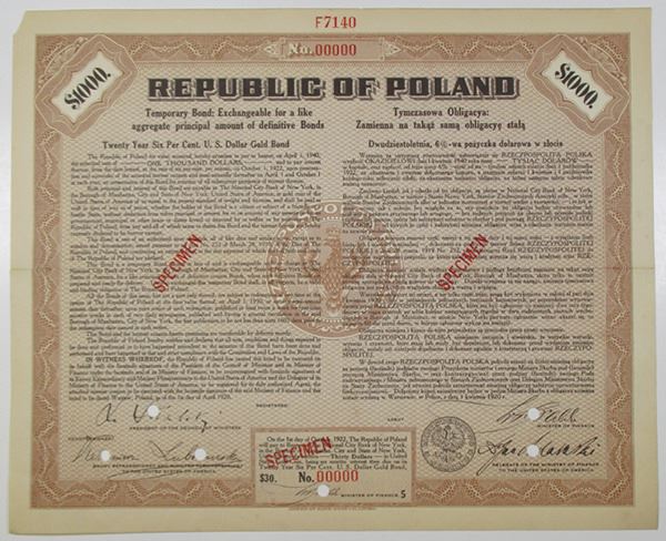 Poland, 1920. $1000 Specimen 6% Temporary U.S. Dollar Gold Bond, Republic of Poland, Temporary Bond: Exchangeable for a Like Aggregate Principal Amount of Definitive Bonds, Black text with brown border and background. Red specimen overprints, 00000 serial number and POCs. Archival splitting, Fine condition, ABNC.