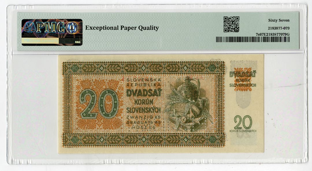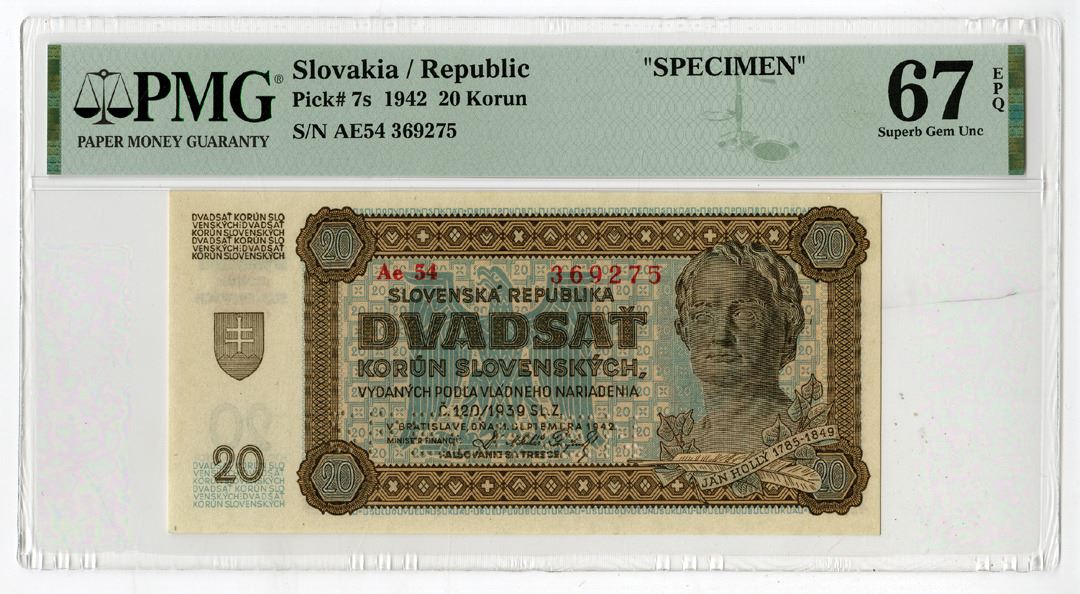 Slovakia, 1942. 20 Korun, P-7s, Specimen Banknote, Brown on blue and pinkish underprint, Arms at left and eagle at the center, Portrait of J. Holly at right, S/N AE54 369275, PMG graded Superb Gem Uncirculated 67 EPQ.