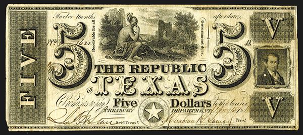 Texas. $5. 1840. P-25. Seated Indian brave at top center, large 5s flanking. Cut cancelled three times. Slight paper tone at right end. Nice Very Good.
