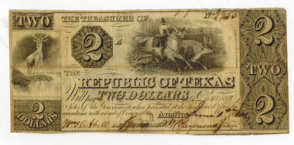 Texas, 1840, $2, Cr.A-2, Issued, Cowboy ropes steer top middle, Stag at left, S/N 2953, blank back, Fine to Choice Fine condition with almost full margins, Cut Cancel, Printer: Endicott & Clark, New Orleans, Scarce note.