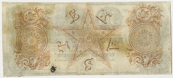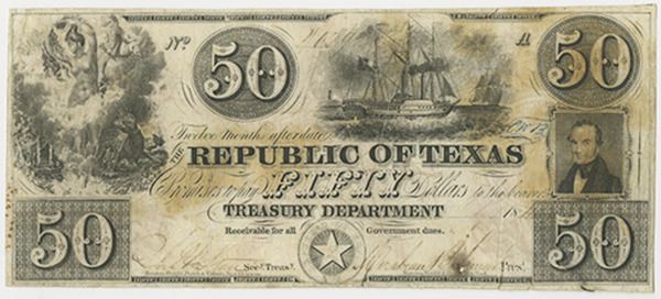 Texas. 1841. $50, Cr. A7, Issued and cut cancelled obsolete banknote, Steamship at top, allegorical woman and seahorse at left, cut cancelled with archivally reinforced cancels, VF to Choice VF with a small stain on the lower right bottom margin. RWHE.