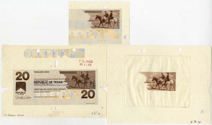 Texas and New York. Republic of Texas Travelers Check, 1978, Lot of 3 progress proof items, Includes: $20 Large Die Proof Obverse Traveler's Check, and 2 different Vignette formats, AU to CU condition, Printed on planchetted security paper.