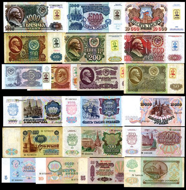 Transnistria, lot of 10 provisional issue notes, consisting of Russia (USSR) Roubles with stamp-stickers, denominations from 10 to 10,000 Roubles, generally VF to UNC.