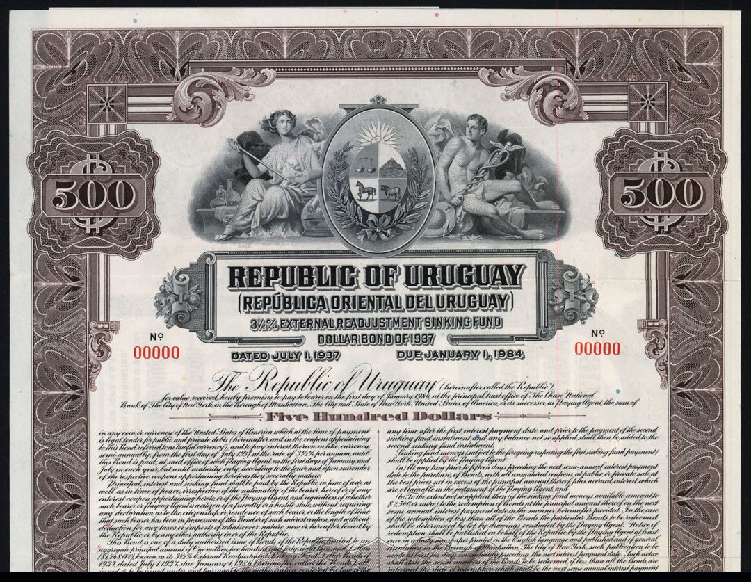 Uruguay, lot of 2 bonds, Includes 1937, $500, 3 1/2% External Readjustment Sinking Fund Dollar Specimen Bond, Brown border, 1937, $500, 4%-4 1/4%-4 1/2% External Readjustment Sinking Fund Dollar Specimen Bond, Orange border, Coupons attached, Uruguay Seal top center flanked by two sitting allegorical figures, POC's, VF-XF condition, ABNC.