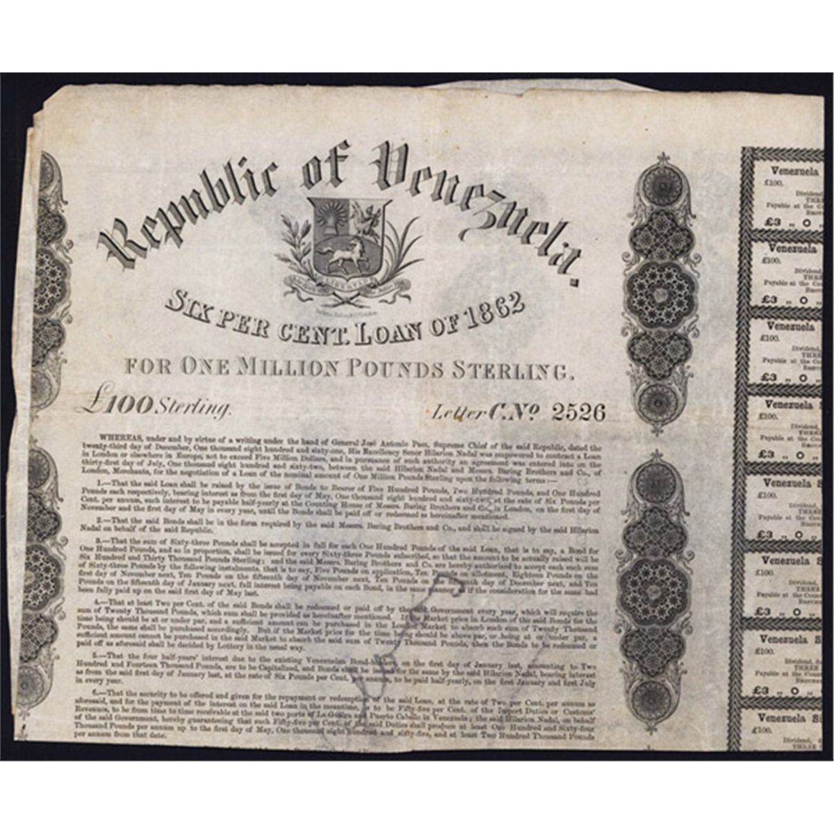 Venezuela, 1863, 100 Pounds Sterling, Series C, Black on thin translucent paper, Venezuela Arms on top under title, coupon on right and ornate border counters flank text, 7 coupons missing, Signed by Fiscal Commissioner of the Republic of Venezuela and Baring Brothers endorsement of signature below, Back blank, Fine condition with folds and edge faults, still very attractive and rare Venezuela Fiscal document.