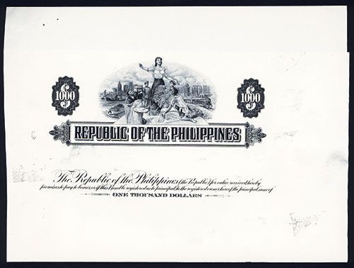Philippines, ND (ca.1940's), $1000, Bond Proof, Vignette top center of woman standing with arm out and people of differing backgrounds kneeling before her with different tributes harbor with ship on left and moving locomotive on right, VF condition.