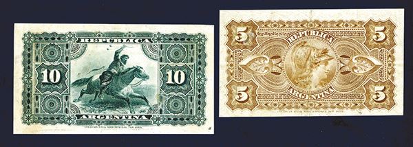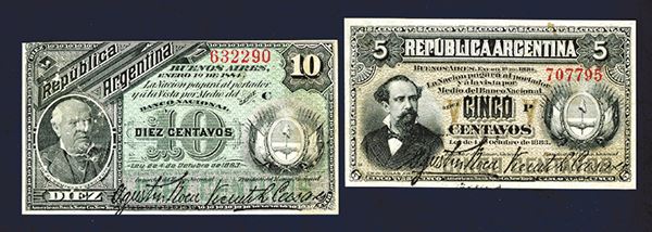 Argentina. Lot of 2 notes, Includes Republica Argentina 1883, 5 centavos, P-5, issued, VF-XF with stamp hinge remnants on back and 1884, 10 centavos, P-6, issued, XF-AU with similar stamp hinge remnants. ABNC.