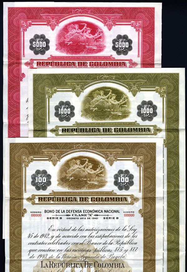 Lot of 2 1943 Colombian Specimen Bonds; 1)100 Pesos Specimen 6% Mortgage Bond, Brown border with allegorical Mercury, woman with torch, a fleet of airplanes with city behind, Arms on bottom, Coupons attached, POC's, VF, ABNC. 2 1000 Pesos Specimen 6% Mortgage Bond, olive border with allegorical Mercury, woman with torch, a fleet of airplanes with city behind, Arms on bottom, Coupons attached, POC's, VF, ABNC.
