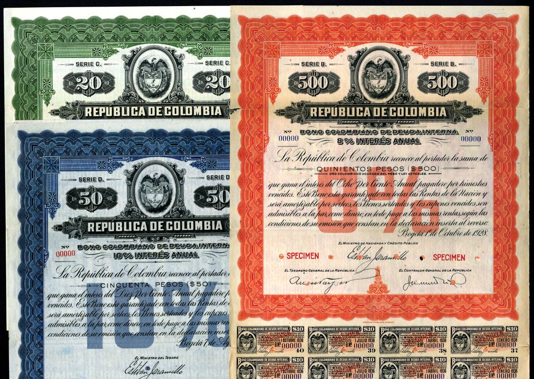Lot of 3 different specimen bonds. Bogota, Colombia. Includes two different 1919 dated bonds, 20 Pesos green border and 50 Pesos, blue border, both 10% bonds and 1928, 500 Pesos, 8%,vOrange Border All with arms of Colombia. All have coupons attached and two in XF and one VF (with splitting at one fold) condition. ABNC.