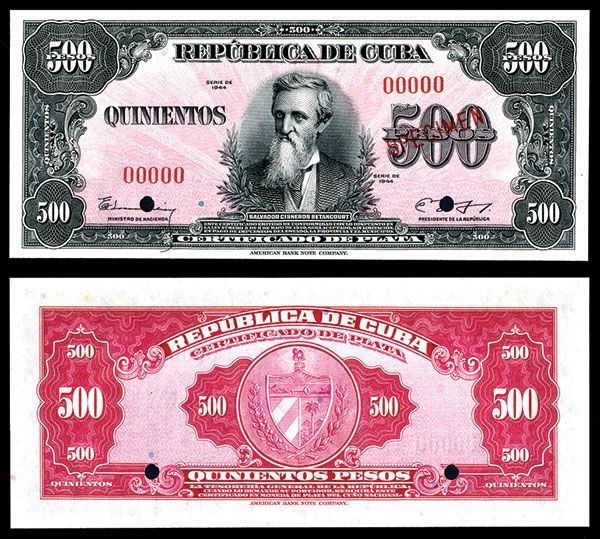 Cuba, 1944, 500 Pesos, P-75s, “Specimen” banknote, Black on red and violet underprint, Betancourt portrait on face, back red with arms, Missing red seal on left of Betancourt's portrait, but possibly issued this way, POC's, PMG graded Choice About Uncirculated 58 - EPQ (Exceptional Paper Quality)”, Rare banknote in any form and this is virtually uncirculated. ABNC.