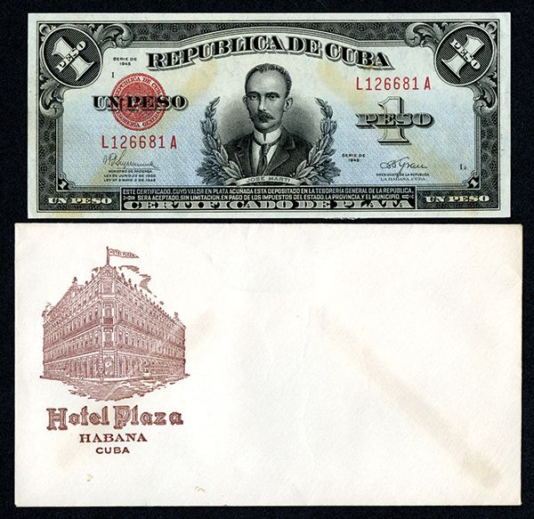Republica De Cuba, 1945 Silver Certificate Issue. Cuba.1945, 1 Peso, P-69f, Issued banknote, Crisp uncirculated, attractive note found in the envelope it was stored in for the last 65 years from Hotel Plaza, Havana, Cuba. Rarely found this nice.