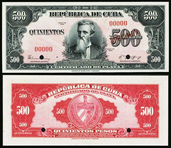 Cuba, 1944, 500 Pesos, P-75s, ÒSpecimenÓ banknote, Black on red and violet underprint, Betancourt portrait on face, back red with arms, Missing red seal on left of Betancourt's portrait, but possibly issued this way, POC's, PMG graded Ò58 Choice About Uncirculated - EPQ (Exceptional Paper Quality)Ó, Rare banknote in any form. ABNC.