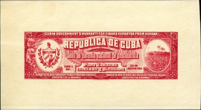 Havana. Cuba ca, 1930-40's. 3 different varieties of Cuban Cigar guaranty proof labels for cigar boxes. Republica De Cuba, "Sello de garantia nacional de procedencia", "Para Tabacos torcidos y picadura", Series A, Ley De julio 16/1912. 1). LDP in red in choice uncirculated; 2). Plate proof in green in XF; 3). Cut down LDP or plate proof in brown in VF. All are on thin card. Each has imprint of local Cuba printer, but the plates and printing were done by Security BNC and these were part of their archives. Rare Cuban Cigar related proofs. SBNC.