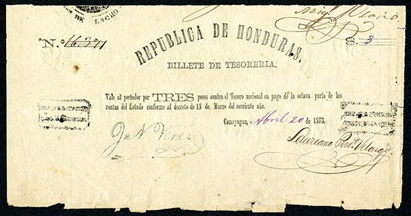 Republica De Honduras, Billete De Tesoreria, 1873 Issued Banknote. Comayagua, Honduras. 1873, 3 Pesos, P-Unlisted, Issued banknote, Typeset text, black on off-white paper, S/N 16,371, endorsed on back, XF-AU with small edge faults on the bottom, light toning and small dark spots on the left middle. Rare note.