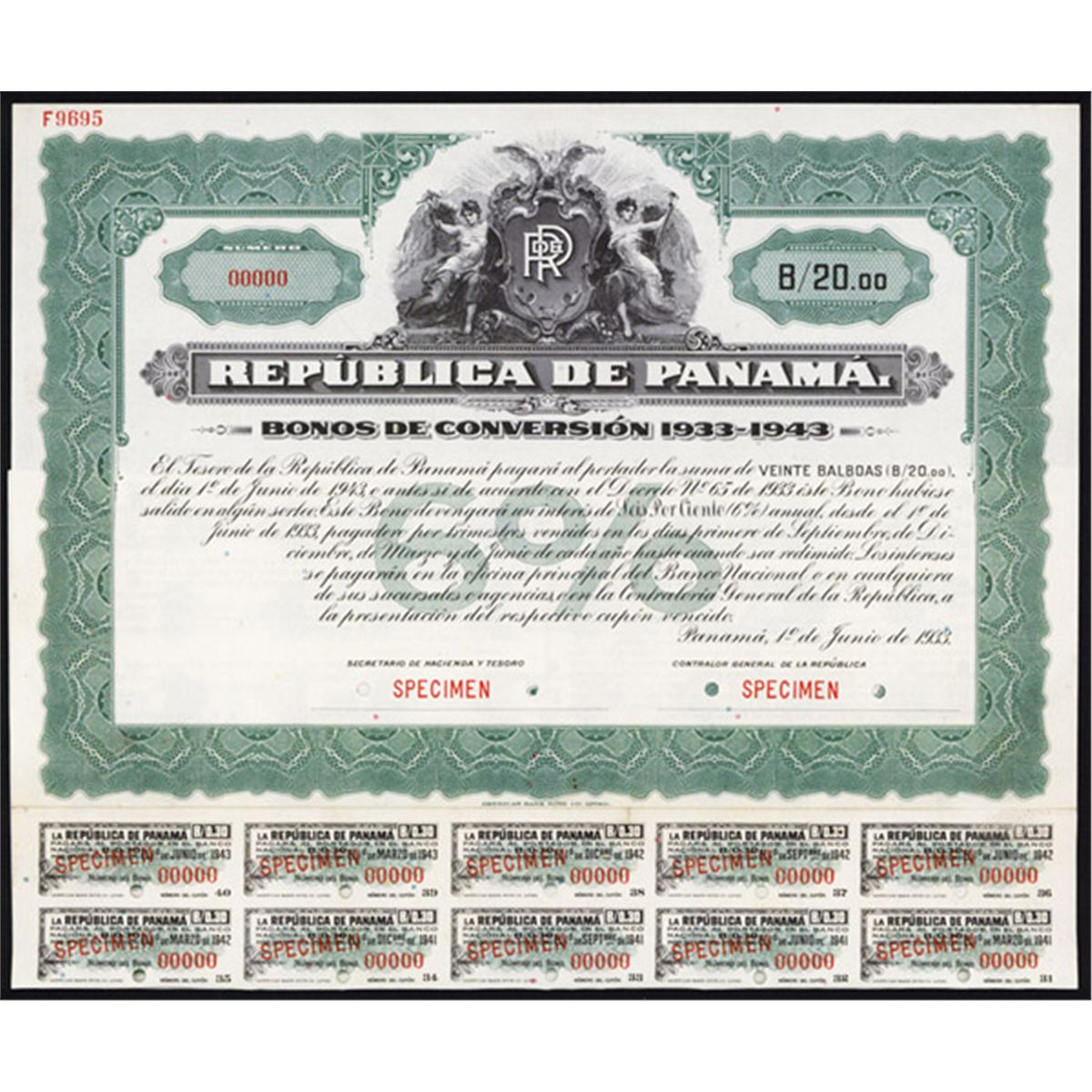 Panama, 1st June, 1933, 20 Balboas, Specimen bond, 6% Bonos De Conversion 1933-43, coupons attached, Black on green border and underprint, Allegorical angels flank eagle on top of shield with Initials R De P. Specimen overprints, POC's, Last Specimen on top right margin, XF condition. ABNC.