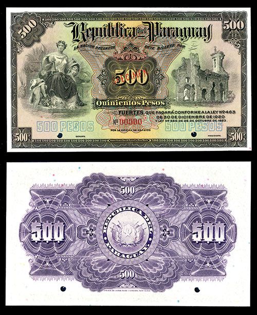 Paraguay, 1923, 500 Pesos, P-154s, Specimen overprints, POC's, S/N 00000, PMG graded Gem Uncirculated 66 EPQ, Attractive note that will be difficult to improve upon, ABNC.