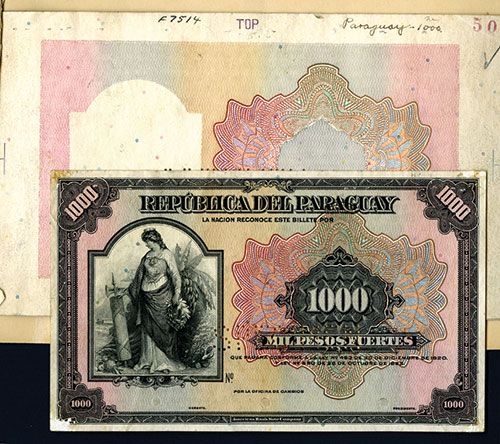 Paraguay, L.1920 & 1923. 1923. 1000 Pesos Fuertes, P-155 Unlisted. Uniface specimen face with undertint booklet. Pin punch “Specimen”. The booklet has 5 different full color undertint pages in a light manila booklet. Archival notations on front of booklet. The banknote has some minor thins at the corners, VF to XF, and the progress proofs are in Fine to XF condition. ABNC.