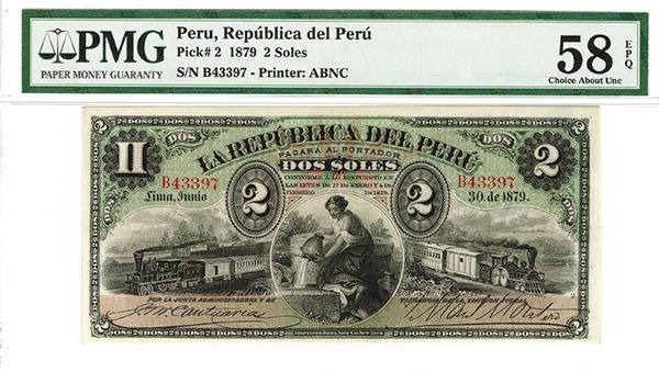 Peru, 1879, 2 Soles, P-2, Black on m/c, trains flank allegorical woman in middle, PMG graded Choice About Uncirculated 58 EPQ with the appearance of CU condition with large margins, bright colors and fresh appearance. ABNC