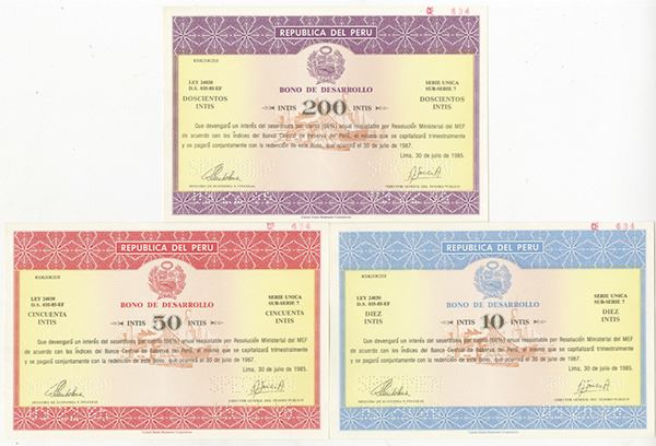 Lima, Peru. 1985, 4 different specimens. They look like "Baby Bonds". All are printed uniface with Arms of Peru in middle with cycloid security engraving on top and bottom. All are "Ley 24030 D.S. 035-85-EF. Denominations are 10 Intis, blue; 50 Intis, red; 200 Intis, purple. All of the bonds have undertints of giant radar, factories and industrial scene. Printed by USBNC. All are pin punch "Specimen". All are choice Uncirculated. USBNC.