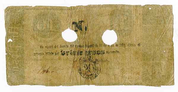 Dominican Republic. 1848, 20 Pesos on 1 Peso = 40 Centavos, P-6, Issued, Black with red overprint on face, black overprint on back, 2 large POC's. DB&C.
