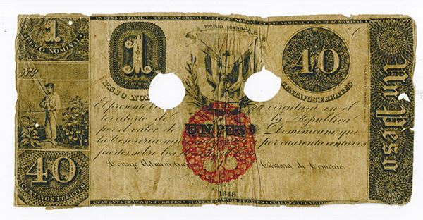 Dominican Republic. 1848, 20 Pesos on 1 Peso = 40 Centavos, P-6, Issued, Black with red overprint on face, black overprint on back, 2 large POC's. DB&C.