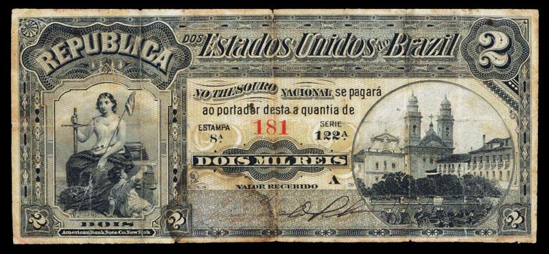 Republica Dos Estados Unidos Do Brasil, 1890 Issue.Brazil, ND (ca.1890). 2 Mil Reis. Estampa 8A. P-10b. Issued banknote. Black on ochre underprint, Woman seated with child at left, church on right, back blue and black, PMG graded Choice Fine 15 with notation of Splits. ABNC.