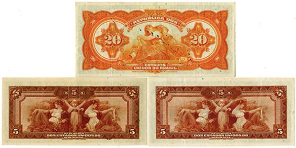 Brazil, Lot or 3 issued notes, includes 1925, 5 Mil Reis, P-29b in VF to Choice VF; 1925, 5 Mil Reis, P-29c, XF to Choice XF condition; and 1931, 20 Mil Reis, P-48d, VF to Choice VF condition. (3)