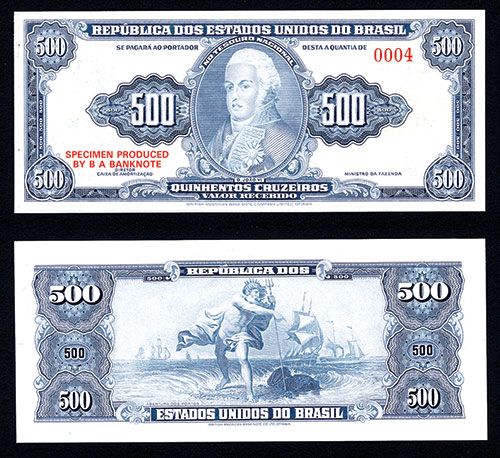 Brazil, ND (ca.1940-60's), 500 Cruzeiros, P-Unlisted, Essay Specimen by British American Bank Note Co. Ltd, Ottawa, Blue with no underprint, Portrait D. Joao VI in middle, back blue with Neptune with sailing ships, S/N 0004, overprinted in red “Specimen Produced By B A Banknote” on lower left. Rare note that evidently was rejected by the Government of Brazil since the only printers of similar banknotes were ABNC and TDLR. BABNC