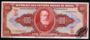 1949-50, Estampa 2A Issues. Lot of 4 different P-unlisted specimen banknotes. All are specimens with "00000" serial numbers and embossed TDLR black or red ovals on the lower right corner. Included are 5; 10 ; 50 and 100 Cruzeiros banknotes, P-142; P-143; P-145 and P-146. All have blank signature blocks for hand signing. All have "Specimen No." on lower left margin and are numbered between 3 and 9. All are in uncirculated to choice uncirculated condition. Rare TDLR specimen banknotes.