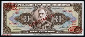 1953-61, Estampa 2A Issues. Lot of 3 different P-unlisted specimen banknotes. All are specimens with "00000" serial numbers and embossed TDLR red ovals. Included are 2; 5 and 20 Cruzeiros banknotes, P-157Ac, Signature 6; P-158d, Signature 6 and P-160b, Signature 6. All have "Specimen No." on lower left margin. All are in uncirculated to choice uncirculated condition. Rare TDLR specimen banknotes.