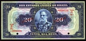E.16A (1931). 20 Mil Reis, P-48a, Specimen banknote, blue on m/c with portrait of First President Manuel Deodoro do Fonseca in middle, back orange with allegorical woman. Specimen overprint, "00000" serial numbers and POC's. Uncirculated to CU condition. ABNC.