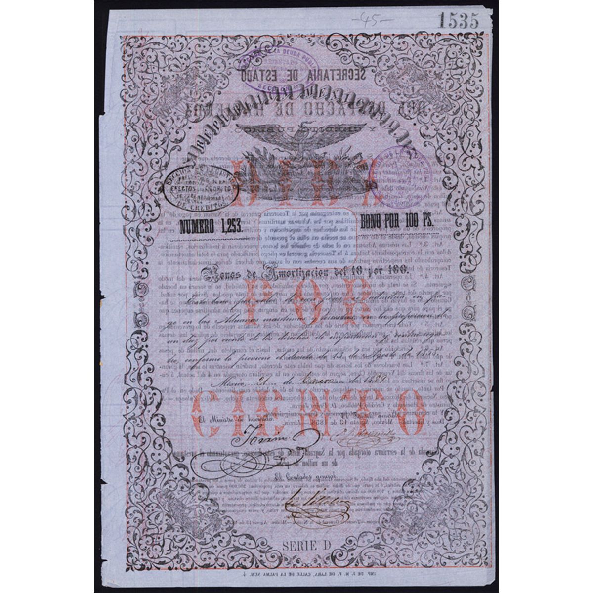 Mexico, 1859, 100 Pesos, Issued and one circular cancel in middle that is difficult to view, Black on light purple and red, 4 pages, coupons attached, VF condition. Scarce Mexican bond.