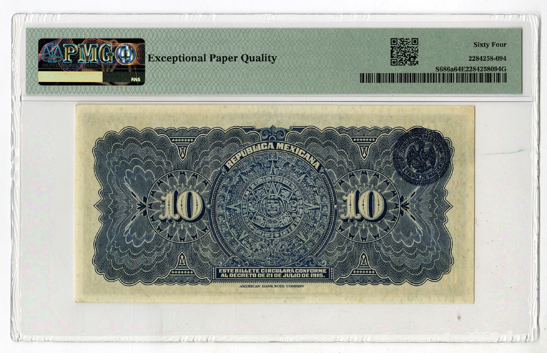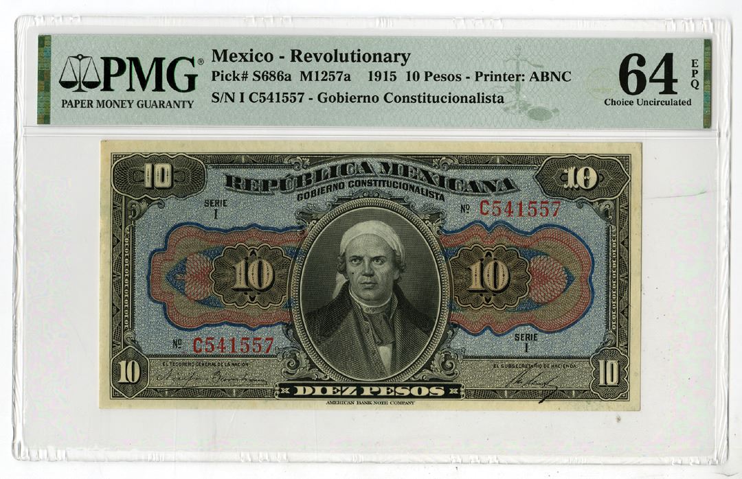 Mexico, 1915. 10 Pesos, P-S686a M1257a, Issued Banknote, Black on blue and m/c underprint, Portrait of Jose M. Morelos y Pavon at center, Back is blue, S/N I C541557, PMG graded Choice Uncirculated 64 EPQ, ABNC.