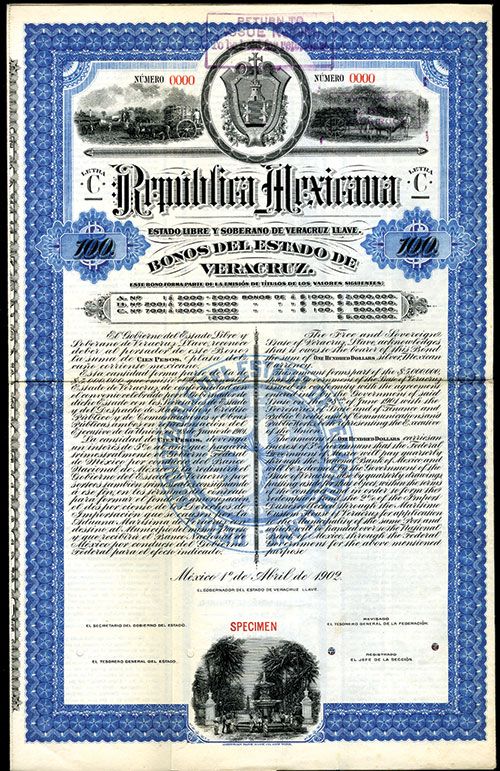 Veracruz. 1902. 100 Pesos, Letter C, 5% Bond. Blue border and undertint. Sugar cane on wagon on top left, Arms of Veracruz in middle and farmer with bags of beans on right with fountain on bottom. Red SPECIMEN overprint and POC. Coupons attached. XF Condition. ABNC.