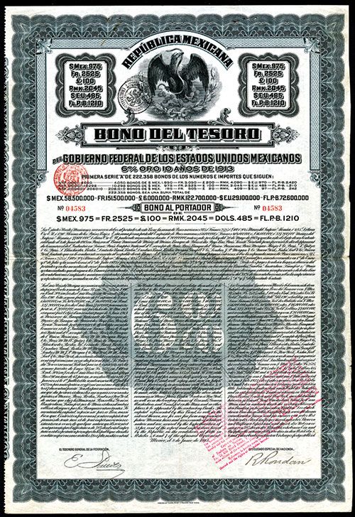 Mexico, 1913. 975 Pesos - 2525 Francs - 100 Pounds Sterling - 2045 RMK - $485. Serie A. 6% Gold bond. Del Gobierno Federal De Los Estados Unidos Mexicano, Arms of Mexico in middle with different currency amounts on left and right. Gray-Blue border and undertint. No coupons attached. VF condition. ABNC. Scarce Speculative bond.