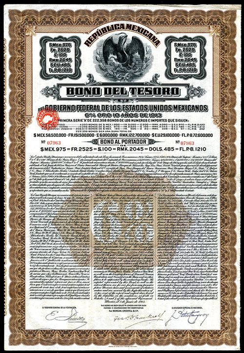 Mexico, 1913. 975 Pesos - 2525 Francs - 100 Pounds Sterling - 2045 RMK - $485. Serie A. 6% Gold bond. Del Gobierno Federal De Los Estados Unidos Mexicano, Arms of Mexico in middle with different currency amounts on left and right. Black with brown border and undertint. No coupons attached. VF condition. ABNC. Scarce Speculative bond.